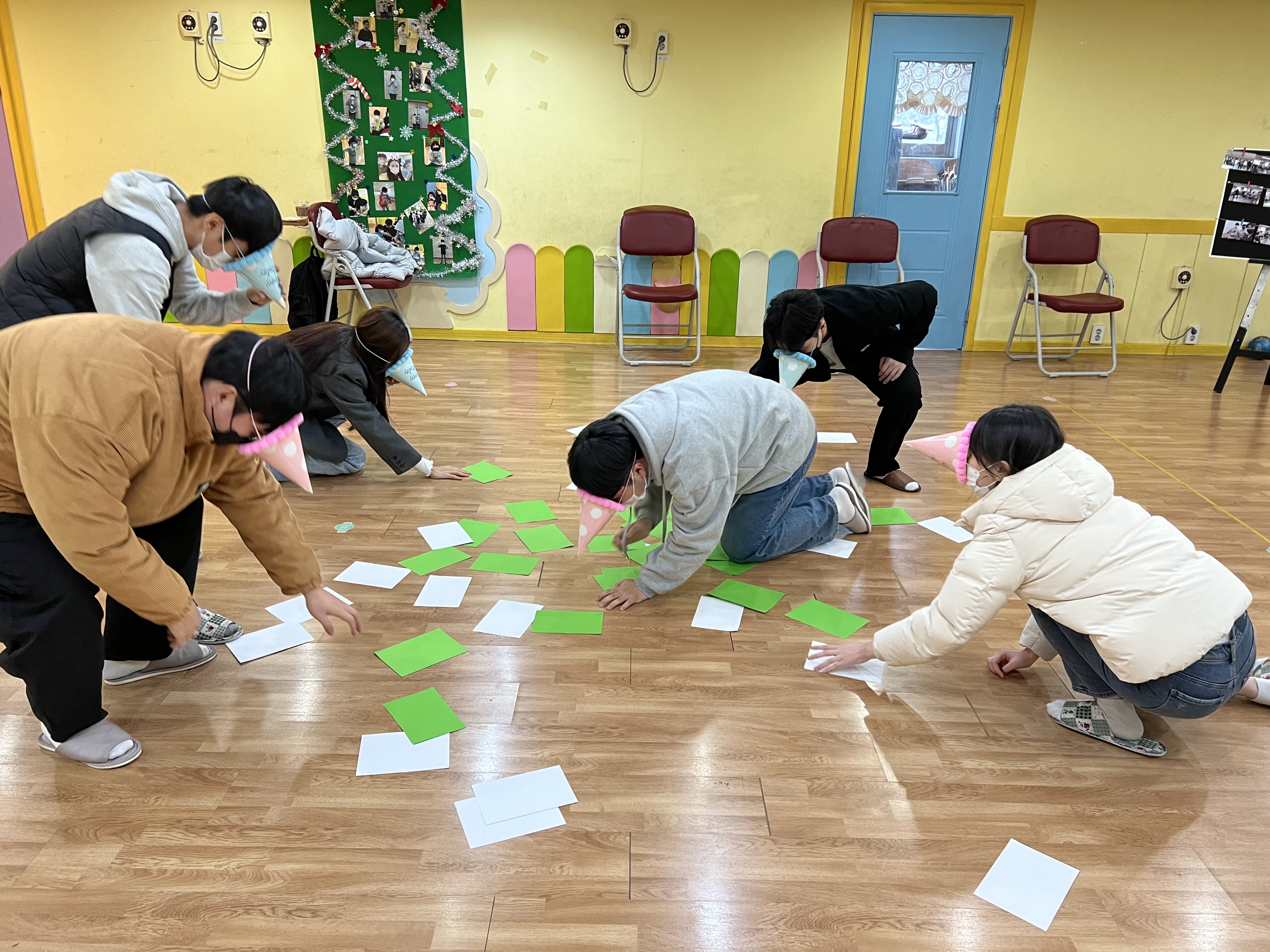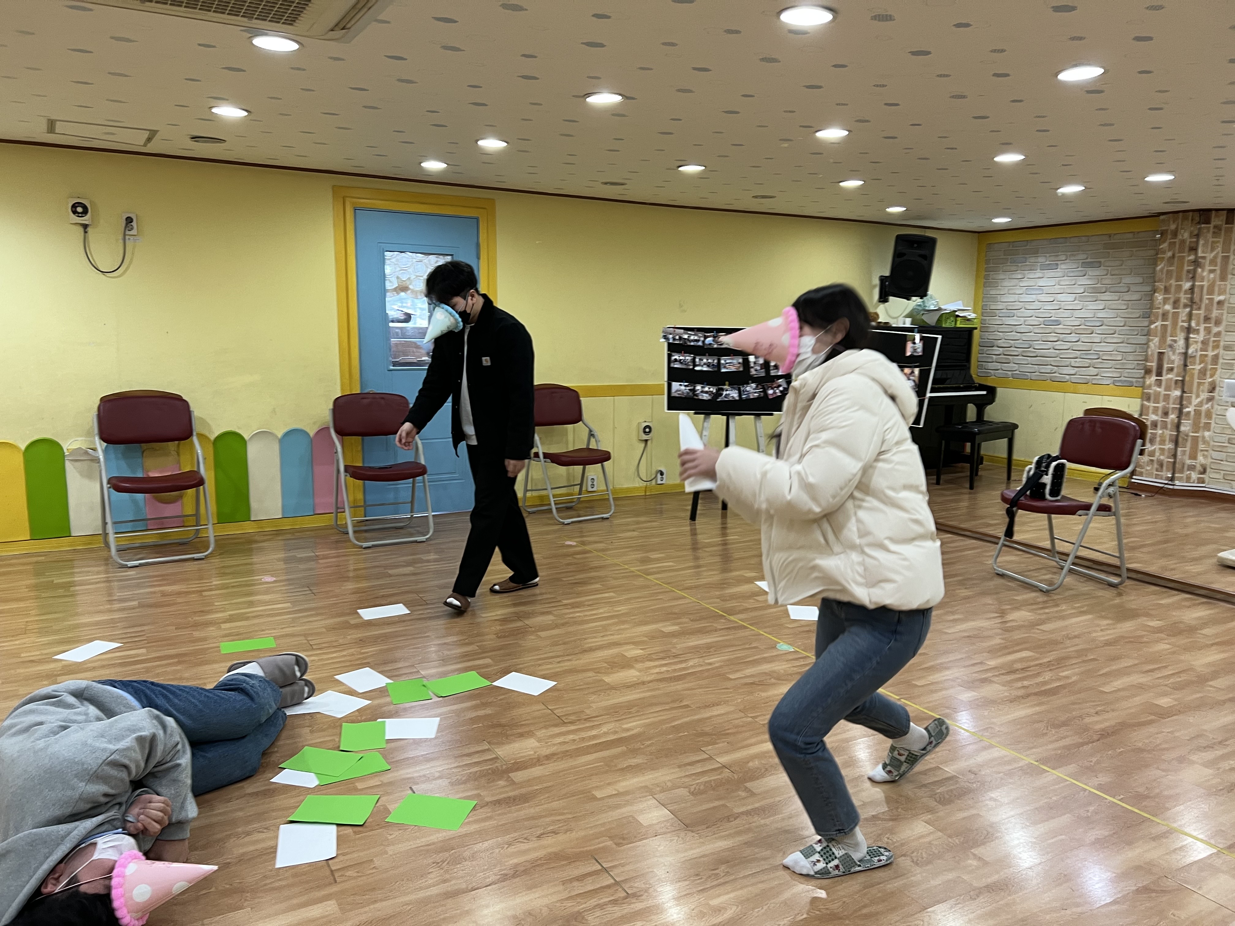 작은 구멍으로만 보이는 고깔을 쓰고 각자 팀에게 해당 된 색종이를 가져갑니다.
