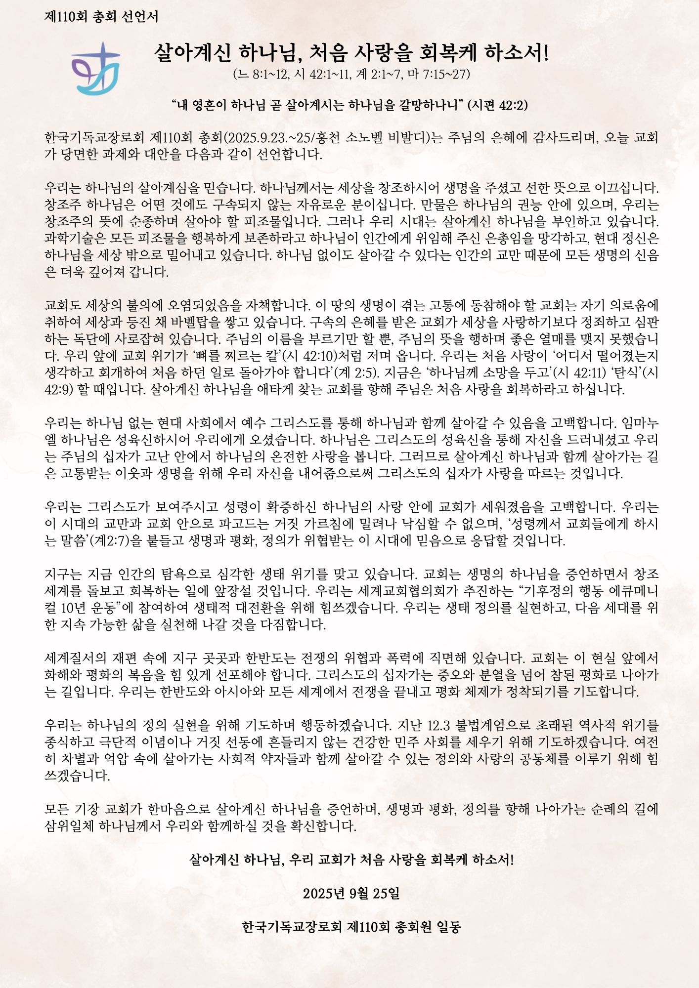 한국기독교장로회 제110회 총회(2025.9.23.~25/홍천 소노벨 비발디)는