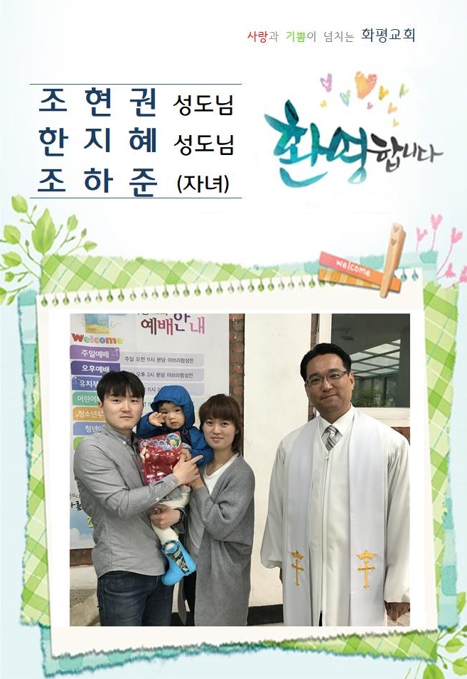 조현권, 한지혜 성도님, 조하준 아기 화평가족이 되심을 환영합니다.