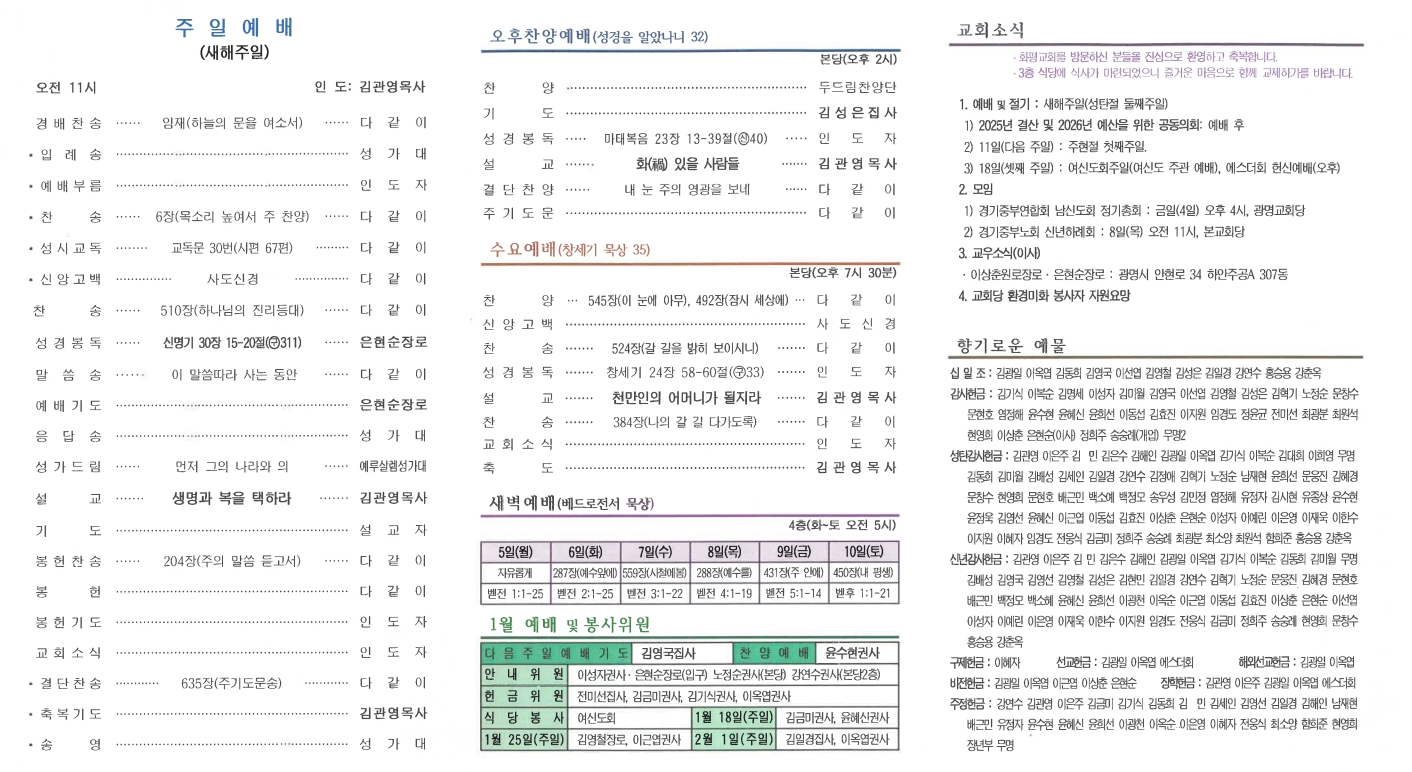 | 이전글 | 20260111 주현절 첫째주일 | 운영자 | 2026.01.10 | 0 | 21 |