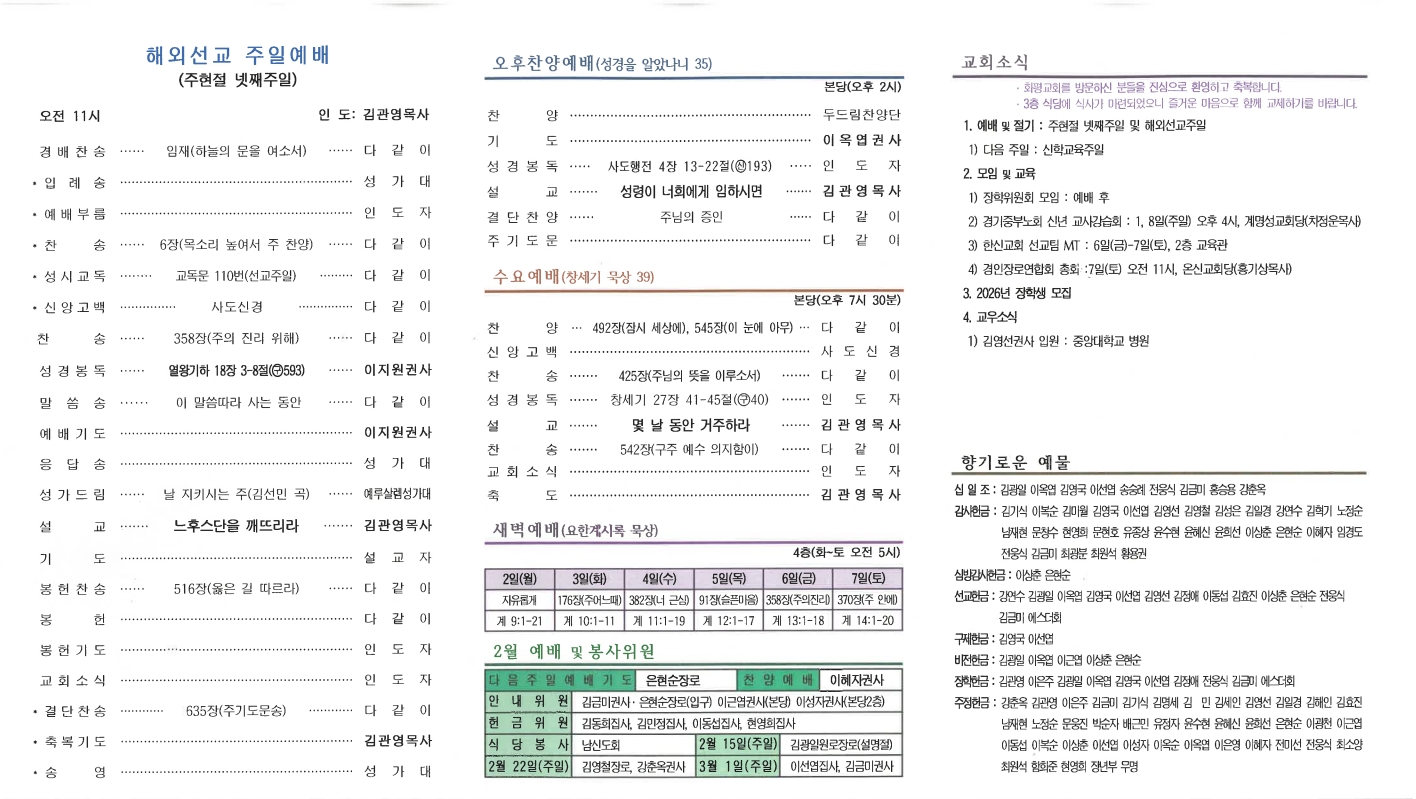 | 이전글 | 20260208 신학교육주일 | 운영자 | 2026.02.07 | 0 | 6 |