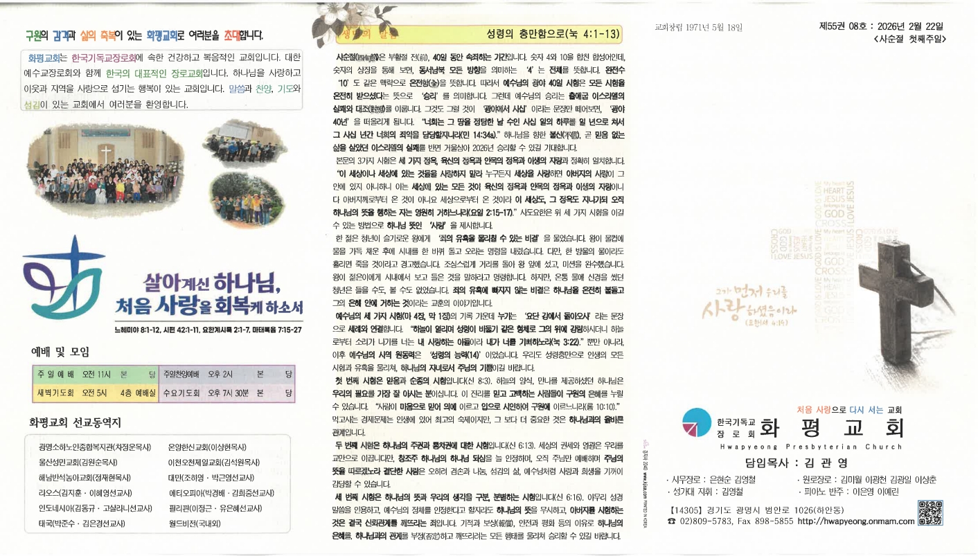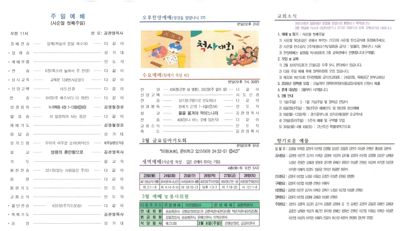 | 다음글 | 20260215 설명절 주일 | 운영자 | 2026.02.14 | 0 | 37 |