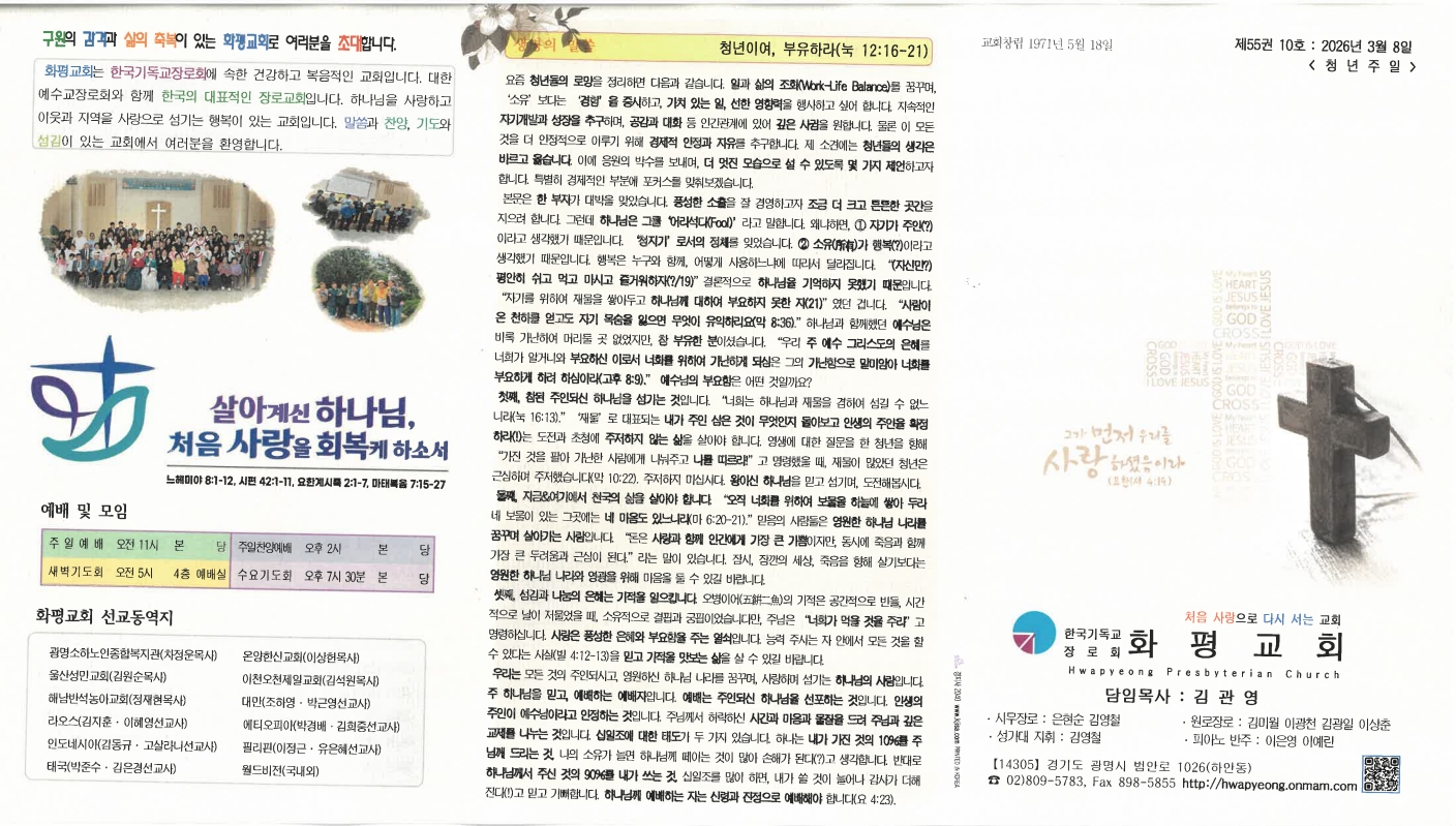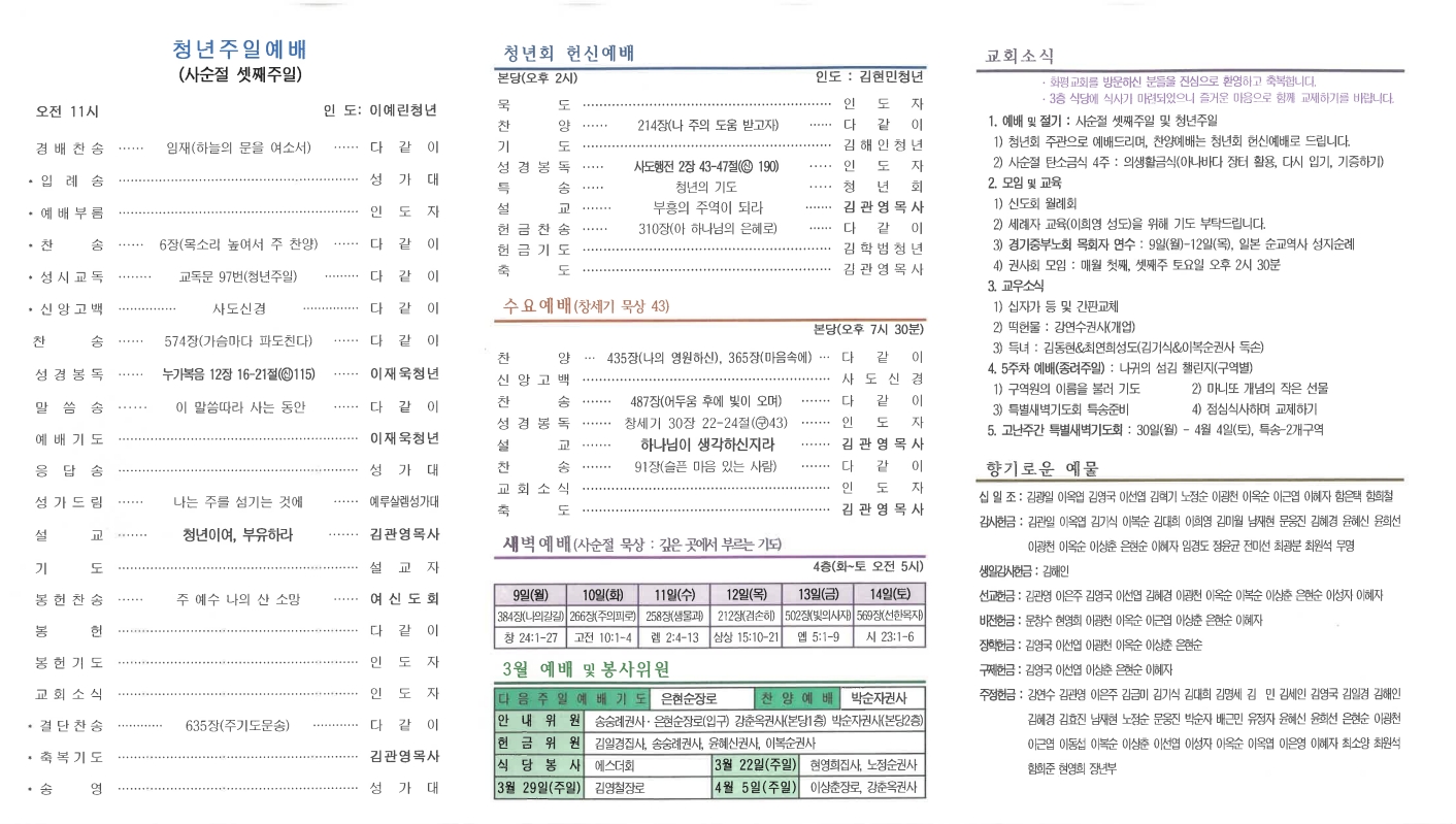 | 이전글 | 20260315 총회순교자기념주일 및 사순절넷째주일 | 운영자 | 2026.03.14 | 0 | 21 |